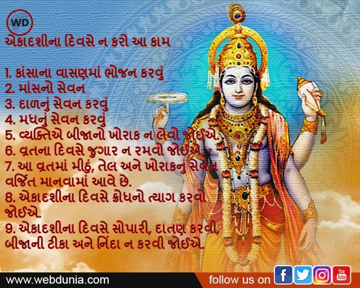 અગિયારસનુ હિન્દુ ધર્મમાં ખૂબ મહત્વ છે. ધર્મ ગ્રંથોમાં એકાદશીને બધી તિથિયોમાં સર્વશ્રેષ્ઠ માનવામાં આવે છે. આ દિવસે ભગવાન વિષ્ણુની પૂજા અને કર્વામાં આવેલ જપ-તપ દાન વગેરેનુ ખૂબ જ મહત્વ છે. ત્રિમૂર્તિ બ્રહ્મા, વિષ્ણુ અને મહેશજી માં ભગવાન વિષ્ણુજીને જગતનો પાલનહાર અર્થાત પાલન કરનાર માનવામાં આવે છે અને એકાદશી એ વિષ્ણુ ભગવાનની પ્રિય તિથિ છે. તેથી આ દિવસે કેટલીક વિશેષ વાતોનુ ધ્યાન રાખવુ જોઈએ જેથી હરિની કૃપા પ્રાપ્ત થઈ શકે