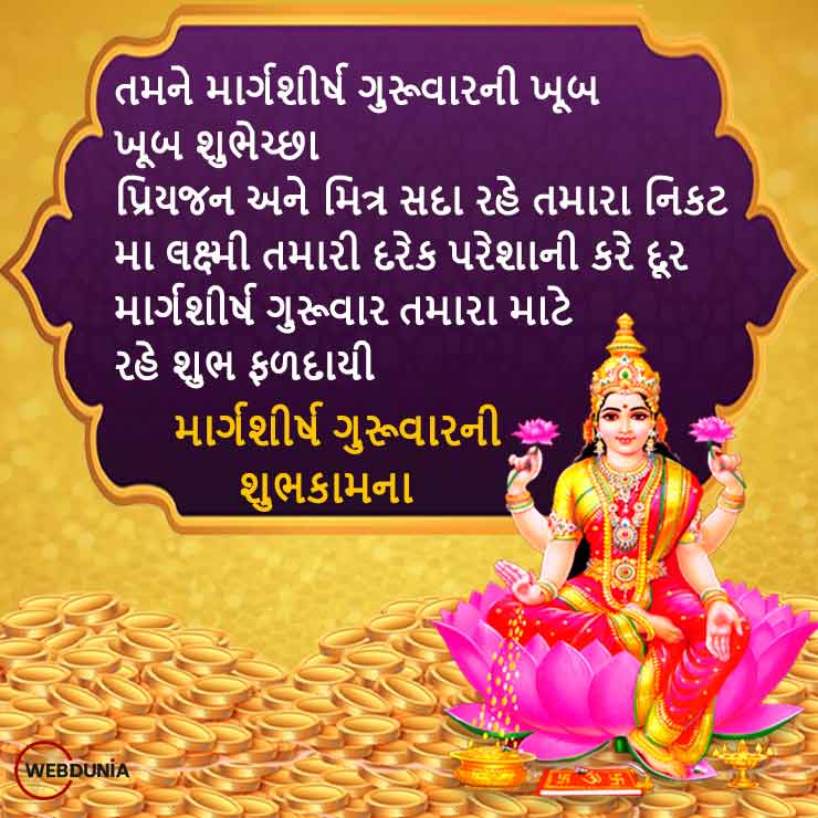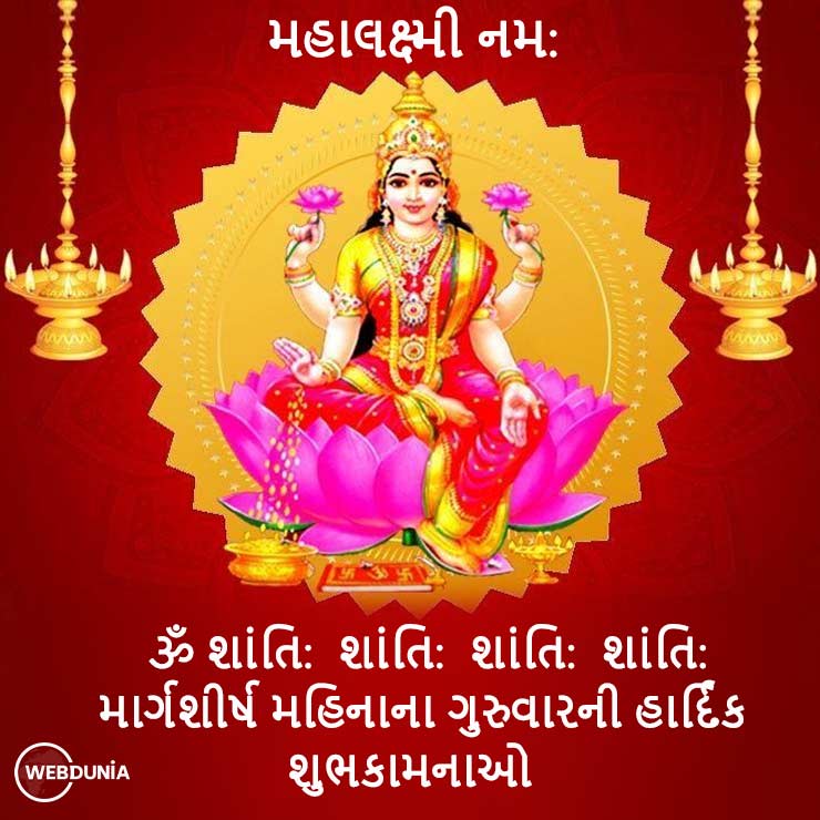 Margashirsha Guruvar Vrat માર્ગશીર્ષ ગુરુવારે વ્રત કરવાથી ભક્તોના જીવનમાં ધન, સફળતા અને સુખ-સમૃદ્ધિ આવે છે, તેથી ભક્તો આ વ્રત ખૂબ જ ભક્તિભાવથી કરે છે. આ વ્રતમાં દેવી લક્ષ્મીને શણગારવામાં આવે છે અને પૂજા કરવામાં આવે છે. આવી સ્થિતિમાં, આ ખાસ અવસર પર, તમે આ ગુજરાતી શુભેચ્છાઓ, કોટ્સ, વ્હોટ્સએપ સંદેશાઓ, ફેસબુક શુભેચ્છાઓ મોકલીને તમારા પ્રિયજનોને માર્ગશીર્ષ ગુરુવારની શુભકામનાઓ આપી શકો છો.