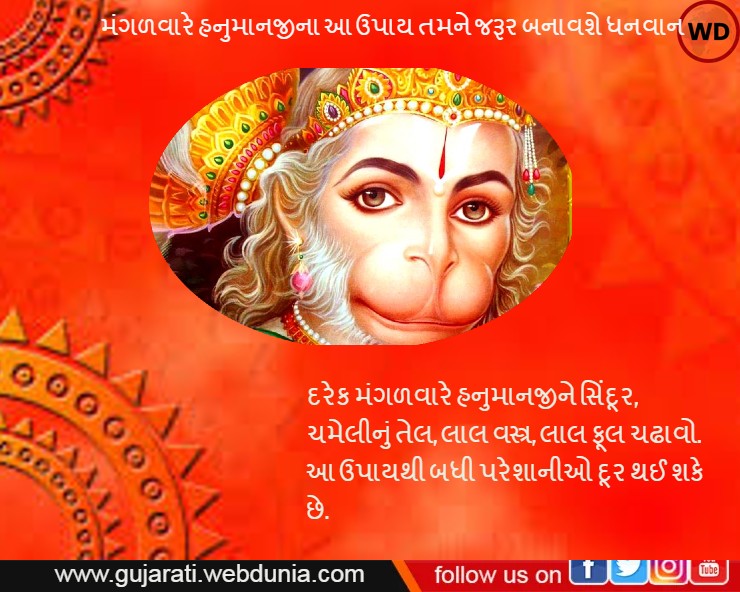 દરેક મંગળવારે હનુમાનજીને સિંદૂર, ચમેલીનું તેલ, લાલ વસ્ત્ર, લાલ ફૂલ ચઢાવો. આ ઉપાયથી બધી પરેશાનીઓ દૂર થઈ શકે છે.