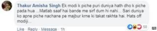 ઠાકુર અમીશા સિંહ લખે છે કે એક મોદી પાર સમગ્ર દુનિયા હાથ ધોઈને પાછળ પડી છે. મતલબ સાફ છે કે વ્યક્તિમાં દમ જ નહીં પરંતુ સમગ્ર દુનિયાને પોતાની પાછળ નચાવાની તાકાત પણ છે.