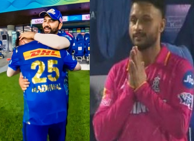 બંને ટીમો વચ્ચે રમાયેલી આ મેચમાં, રાજસ્થાન રોયલ્સ માટે ઝડપી બોલર આકાશ માધવાલે ડેબ્યૂ કર્યું. મેચ પછી, આકાશ માધવાલનો એક વીડિયો સોશિયલ મીડિયા પર વાયરલ થઈ રહ્યો છે, જેમાં તે રોહિત શર્મા સાથે જોવા મળી રહ્યો છે. ઉલ્લેખનીય છે કે મેચ પછી, આકાશ માધવાલ રોહિત શર્માનું હાથ જોડીને સ્વાગત કરતો જોવા મળ્યો અને પછી બંને વચ્ચે એક નાની વાતચીત થઈ. અત્રે એ ઉલ્લેખનીય છે કે આકાશ માધવાલે રોહિતની કેપ્ટનશીપ હેઠળ IPLમાં ડેબ્યૂ કર્યું હતું, ત્યાર તે મુંબઈ ટીમનો ભાગ હતો.