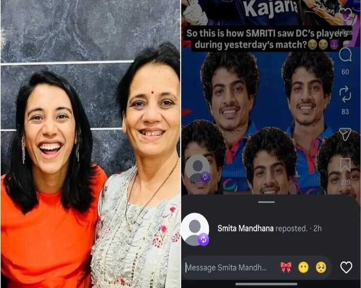 સ્મૃતિ મંધાનાની માતા સ્મિતા મંધાનાએ એક વાયરલ મીમ ફરીથી પોસ્ટ કર્યો જેમાં કટાક્ષમાં કહેવામાં આવ્યું હતું કે સ્મૃતિએ WPL ફાઇનલમાં દિલ્હી કેપિટલ્સના બોલરોને એવી રીતે માર્યા હતા જાણે તેણીએ વિરોધી ખેલાડીઓમાં તેને ભૂતપૂર્વ બોયફ્રેન્ડ પલાશ મુચ્છલનો ચહેરો જોયો હોય, જેને તેણીએ બાઉન્ડ્રી પાર મોકલી દીધો. સ્મિતા મંધાનાએ તેના ઇન્સ્ટાગ્રામ એકાઉન્ટ પર મીમ શેર કર્યો અને તેની પુત્રીની હિંમત અને દ્રઢતાની પ્રશંસા કરી.