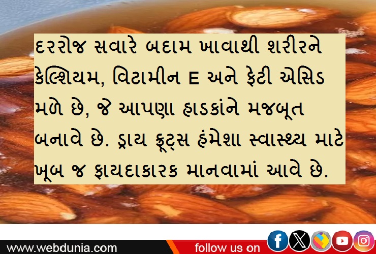 1. દરરોજ સવારે બદામ ખાવાથી શરીરને કેલ્શિયમ, વિટામીન E અને ફેટી એસિડ મળે છે, જે આપણા હાડકાંને મજબૂત બનાવે છે. ડ્રાય ફ્રૂટ્સ હંમેશા સ્વાસ્થ્ય માટે ખૂબ જ ફાયદાકારક માનવામાં આવે છે.