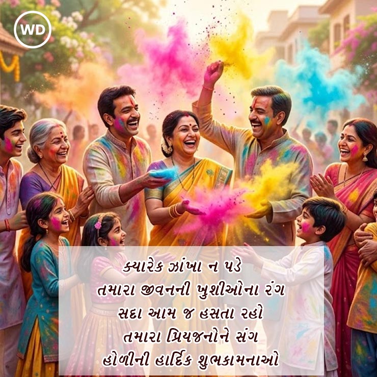 Happy Holi 2026 Quotes in Gujarati - રંગોનો તહેવાર હોળી એ ફક્ત ઉજવણી જ નથી પણ સંબંધોને ફરીથી જાગૃત કરવાની તક પણ છે. આ તહેવાર ખરાબ પર સારાના વિજયનું પ્રતીક છે અને વસંતના આગમનનો આનંદ લાવે છે. હોલિકા દહનથી શરૂ થઈને ધુળેટી સુધી ચાલુ રહેતો આ તહેવાર ભૂતકાળના સંઘર્ષો અને ફરિયાદોને ભૂલીને લોકોને એકબીજાની નજીક લાવે છે. લોકો રંગો, ગુલાલ (રંગીન પાવડર), મીઠાઈઓ અને ઢોલ સાથે હોળીની ઉજવણી કરે છે. આ ખાસ દિવસને યાદગાર બનાવવા માટે પ્રિયજનો માટે હૃદયપૂર્વકની શુભેચ્છાઓ પણ એટલી જ મહત્વપૂર્ણ છે. તેથી, જો તમે પણ તમારા મિત્રો, સંબંધીઓ અને પ્રિયજનોને ખાસ રીતે શુભેચ્છા પાઠવવા માંગતા હોય, તો ચાલો અહી અમે કેટલાક શુભ સંદેશાઓ, સ્ટેટસ, ઈમેજીસ અને GIF શેર કરી રહ્યા છે જે તમે તમારા પ્રિયજનોને શેર કરી શકો છો.