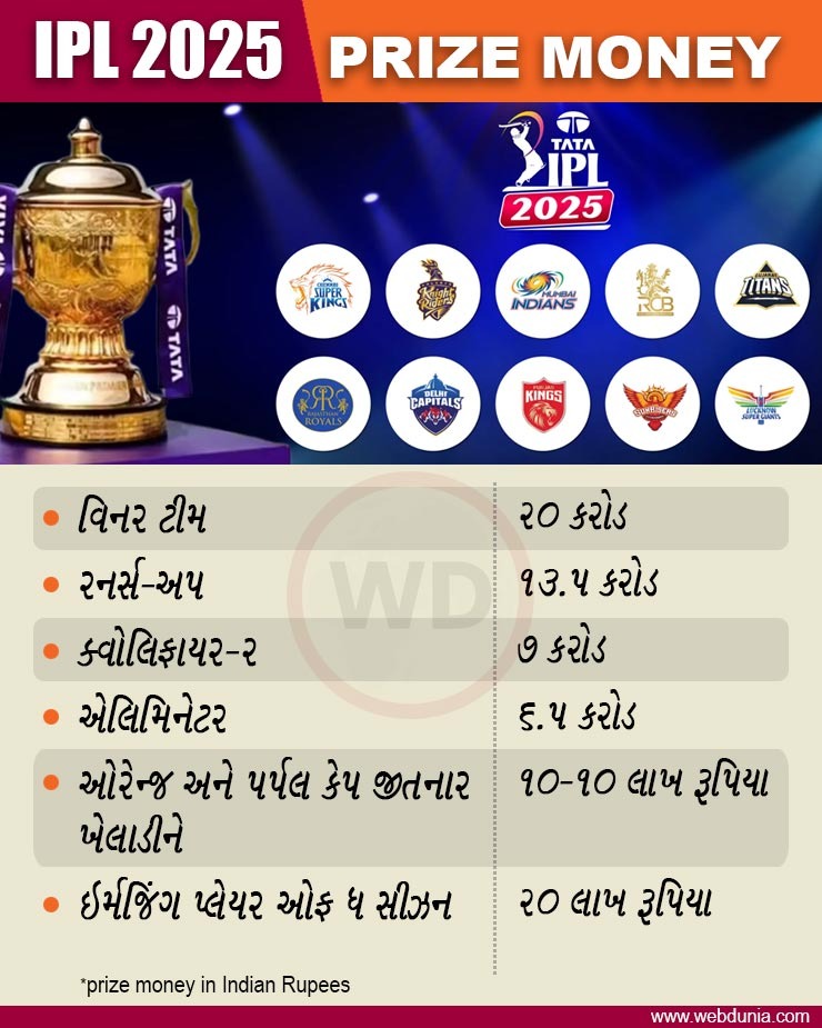 ઉલ્લેખનીય છે કે IPL કે BCCI દ્વારા વિજેતા ટીમને ઇનામ તરીકે કેટલા કરોડ રૂપિયા આપવામાં આવશે તે અંગે કોઈ સત્તાવાર માહિતી જાહેર કરવામાં આવી નથી. પરંતુ એવું માનવામાં આવે છે કે ચેમ્પિયન ટીમ અને રનર-અપ ટીમને 2022 થી ચાલી આવતી સમાન ઇનામ રકમ મળશે. જો આવું થાય, તો ચેમ્પિયન ટીમને 20 કરોડ મળશે, જ્યારે રનર-અપ ટીમને 13.5 કરોડની ઇનામ રકમ આપવામાં આવશે. સાથે જ ક્વોલિફાયર-2 માંથી બહાર થયેલી ટીમને 7 કરોડની ઇનામ રકમ અને એલિમિનેટરમાં હારનાર ટીમને 6.5 કરોડની ઇનામ રકમ આપવામાં આવશે.