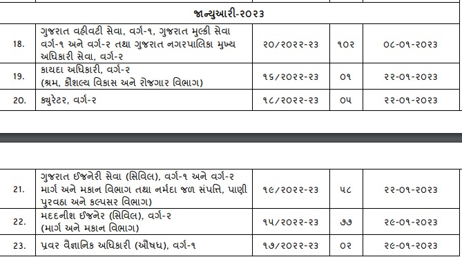 GPSCની વર્ગ-1 અને વર્ગ-2ની પરીક્ષા 8 જાન્યુઆરી 2023ના રોજ યોજાશે. જ્યારે કાયદા અધિકારી, ક્યૂરેટરની પરીક્ષા 22 જાન્યુઆરી 2023ના રોજ યોજાશે. તો ગુજરાત ઇજનેરી સેવાની પરીક્ષા પણ 22 જાન્યુઆરીના યોજાશે. હિસાબી અધિકારી, આચાર્ય વર્ગ-2, ઇજનેરી સેવાની પરીક્ષા 5 ફેબ્રુઆરીએ લેવાશે.