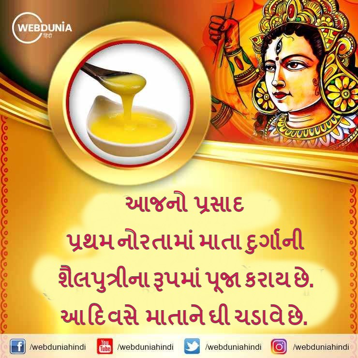 પ્રથમ કે નવરાત્રિનો પ્રથમ દિવસ દુર્ગા માતાનાં પ્રથમ અવતારને સમર્પિત હોય છે. આ દિવસે શૈલપુત્રી માતાને શ્રદ્ધાળુઓ પૂજે છે. આ અવતારમાં એક બાળકી અને પહાડની પુત્રી' તરીકે પૂજા કરવામાં આવે છે. આ દિવસે શ્રદ્ધાળુઓ પીળા વસ્ત્રો પહેરે છે અને માતાને ઘી ચડાવે છે.