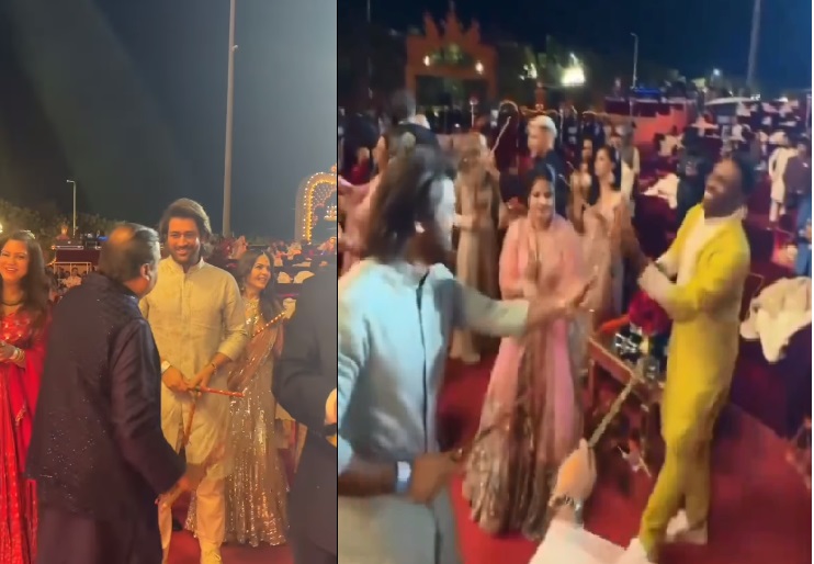Ambani teaches Dhoni Dandiya- જામનગરમાં અનંત અંબાણી અને રાધિકા મર્ચન્ટનાં પ્રિ વેડિંગ કાર્યક્રમમાં વધુ એક વિડીયો વાયરલ થઈ રહ્યો છે જેમાં એમએસ ધોની, પત્ની સાક્ષી અને ડીજે બ્રાવો ગઈકાલે રાત્રે અંબાણીના પ્રી-વેડિંગમાં ગરબાની મજા લેતા નજર આવી રહ્યા છે.
