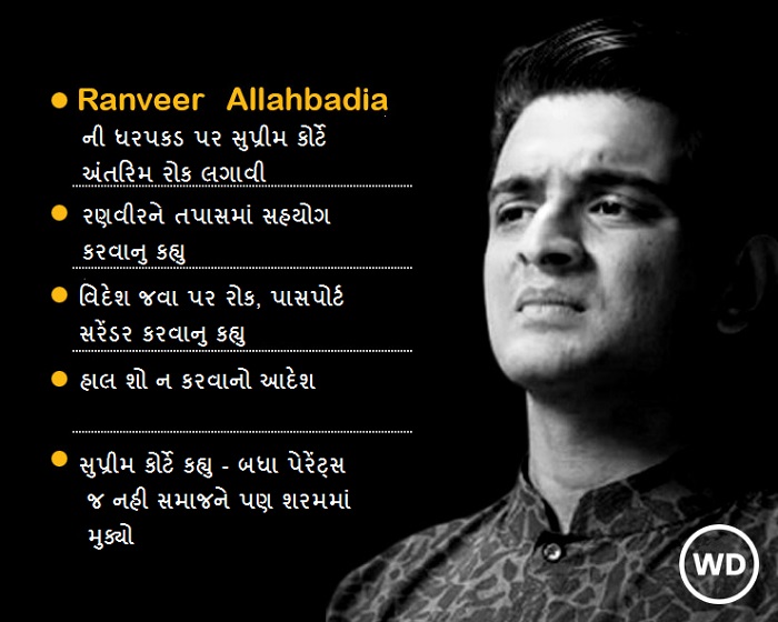 સુપ્રીમ કોર્ટે ઈંડિયાજ ગોટ લેટેંટ શો માં અતિથિ ભૂમિકા દરમિયાન યુટ્યુબર અને પોડકાસ્ટર રણવીર ઈલાહાબાદિયાની ટિપ્પણી પર નારાજગી વ્યક્ત કરી. સુપ્રીમ કોર્ટે ઈલાહબાદિયાના પ્રતિનિધિત્વ કરી રહેલ વકીલને પુછ્યુ કે અશ્લીલતા અને ફૂહડતાનુ માનક શુ છે. કોર્ટે યૂટ્યુબરને તેના વલ્ગર કમેંટ માટે કડક ફટકાર લગાવી છે અને કહ્યુ કે મગજમાં ગંદકી ભરી છે અને આવા વ્યક્તિનો કેસ અમે કેમ સાંભળીએ. પોપુલર હોવાનો મતલબ એ નથી કે તમે કશુ પણ બોલો. સુપ્રીમ કોર્ટની ભારે ફટકાર બાદ યુટ્યુબરને અનેક શરતો સાથે ધરપકડમાંથી રાહત મળી છે.
