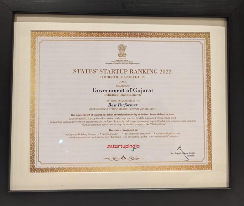આ ફ્રેમવર્ક અન્વયે તાજેતરમાં ૨૦૨૨ના વર્ષના રેન્કિંગ માટે DPIIT અને સ્ટાર્ટઅપ ઇન્ડિયાએ ૩૩ રાજ્યો-કેન્દ્રશાસિત પ્રદેશોનું ૨૫ એક્શન પોઇન્ટ્સ આધારીત ૭ નિર્ણાયક સુધારાઓના ક્ષેત્રોમાં મૂલ્યાંકન-એસેસમેન્ટ કર્યું હતું.આ મૂલ્યાંકનના જાહેર થયેલા પરિણામોમાં ગુજરાતે સતત ચોથી વાર બેસ્ટ પર્ફોર્મર સ્ટેટનો એવોર્ડ મેળવ્યો છે.નવી દિલ્હીમાં આ એવોર્ડ ઉદ્યોગ વિભાગના વરીષ્ઠ અધિકારીઓ અને ટીમ ગુજરાતે સ્વીકાર્યો હતો. રાજ્યમાં સ્ટાર્ટઅપ કલ્ચરને વેગ આપવા ગુજરાતે પહેલરૂપ એવી સ્ટાર્ટઅપ પોલિસી ૨૦૧૫ લોન્ચ કરેલી છે.