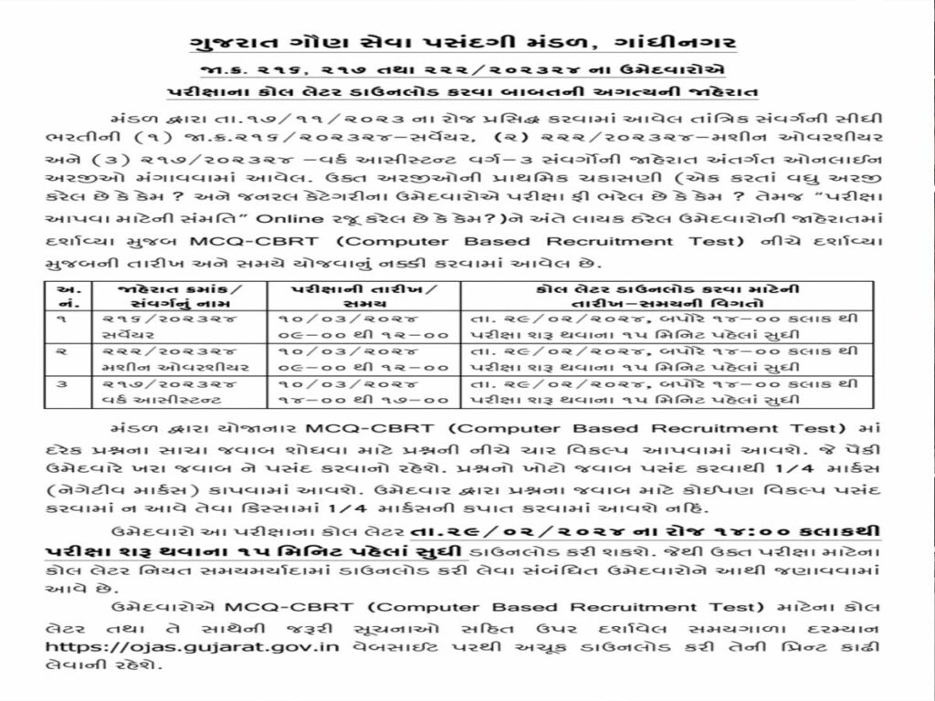 જેને લઈ ગૌણ સેવા પસંદગી મંડળ દ્વારા ઓનલાઈન અરજીઓ મંગાવવામાં આવી હતી. પ્રથમ વખત MCQ-CBRT (Computer Based Recruitment Test) મુજબ ટેસ્ટ લેવાશે.