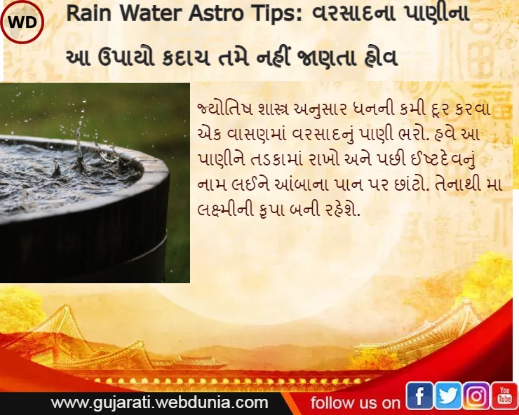 Rain water Remedies - વરસાદના પાણીના ઉપાયઃ ભારતના ઘણા ભાગોમાં વરસાદ પડી રહ્યો છે જ્યાં લોકોને ગરમીથી રાહત મળી રહી છે. તે જ સમયે, વરસાદનું પાણી પણ કરજમાંથી મુક્તિ મેળવવામાં ખૂબ જ મહત્વપૂર્ણ ભૂમિકા ભજવે છે. જ્યોતિષ શાસ્ત્રમાં વરસાદના પાણી વિશે ઘણા વિશેષ ઉપાયો જણાવવામાં આવ્યા છે. ચાલો જાણીએ કે વરસાદના પાણીથી કેવી રીતે વધતા દેવા અને નાણાકીય સંકટને દૂર કરી શકાય છે.