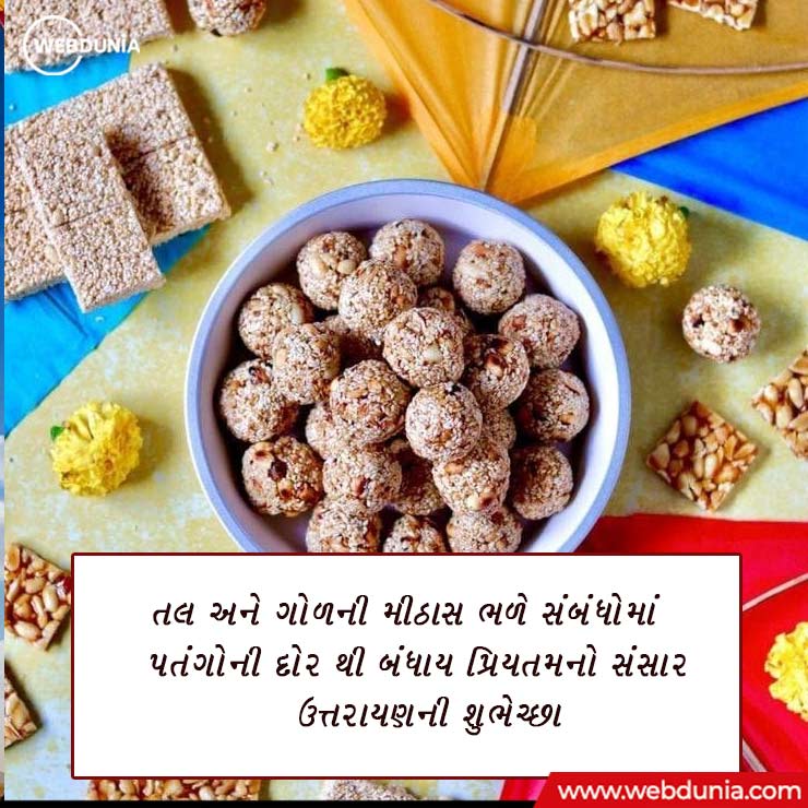 3. તલ અને ગોળની મીઠાસ ભળે સંબંધોમાં પતંગોની દોર થી બંધાય પ્રિયતમનો સંસાર ઉત્તરાયણની શુભેચ્છા