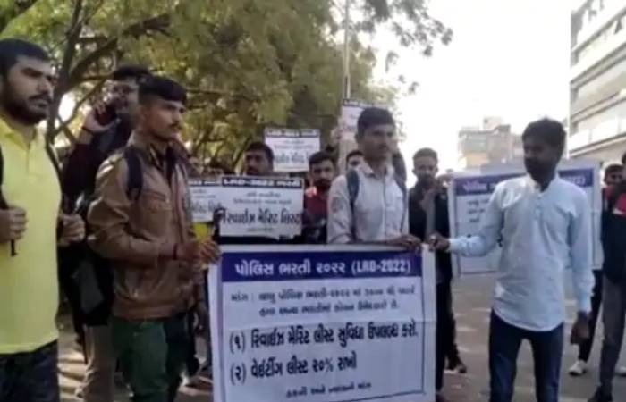 ગાંધીનગરમાં લોકરક્ષક દળના ઉમેદવારોએ 2022ની ભરતીમાં ખાલી પડેલી બેઠકો ભરવાની માંગ સાથે ધરણાં યોજ્યાં હતાં. ઘણા સમયથી 2022ની ભરતીમાં સામાન્ય ઉમેદવારોના કારણે ખાલી પડતી બેઠકો ભરવા અનેક વખત રજૂઆતો કરી હોવા છતાં કોઈ નિકાલ નહીં આવતાં આજે ઉમેદવારોએ આંદોલનનો રસ્તો અપનાવ્યો હતો. પોલીસે તમામ ઉમેદવારોની અટકાયત કરી હતી.